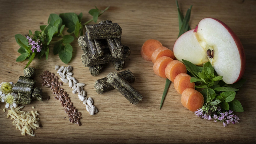 Koostis: õunamass 28,0%, lutsern 28,0%, päevalillejahu 20%, siguri viljaliha 7,0%, niidutaimede ja ürtide helbed 5,0%, porgand, 5,0%, linaseemned 4,0%, kartulitärklis 2,0%, linaseemneõli 0,40%, artišokk 0,20%, piimohaka seemned 0,20%