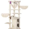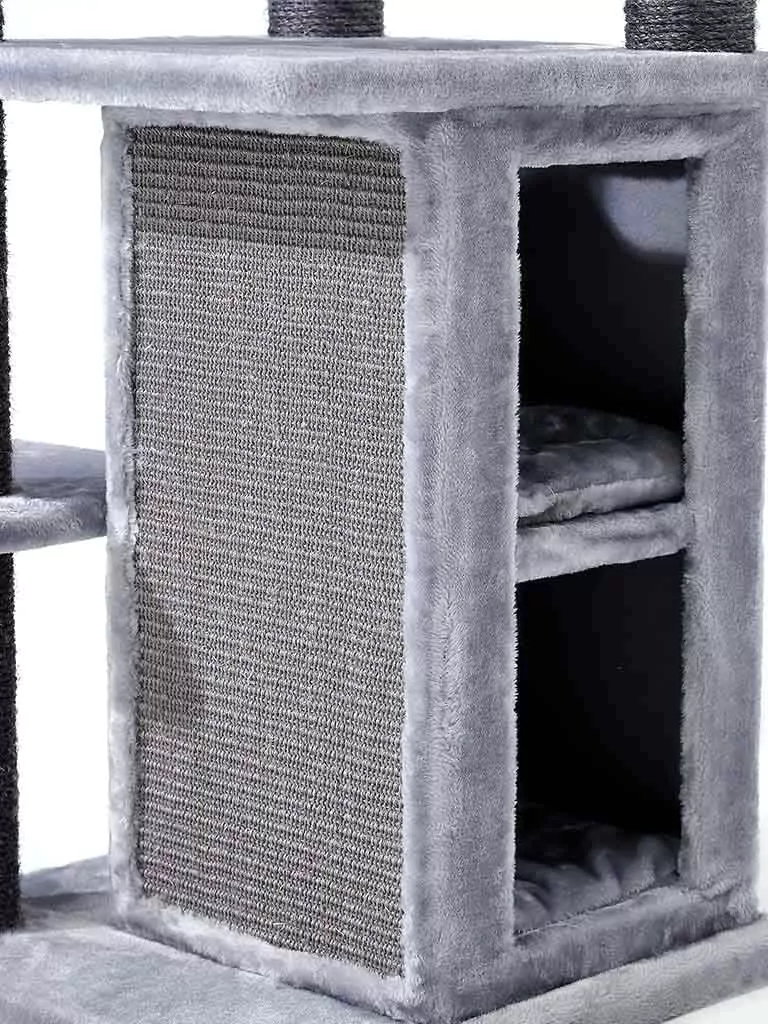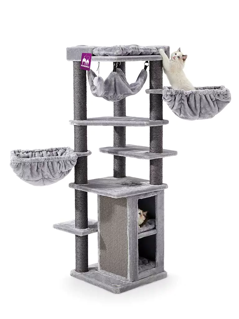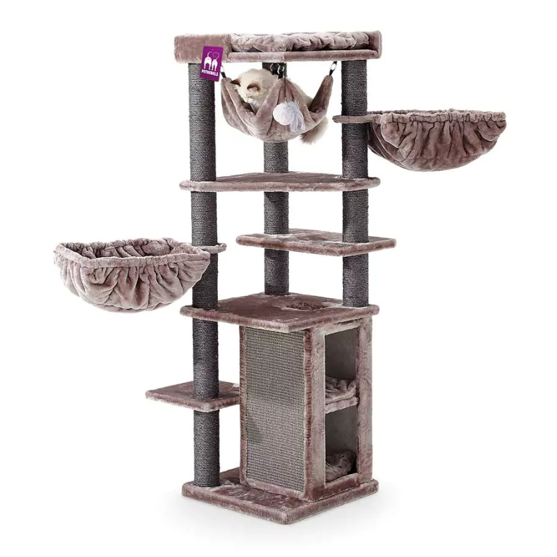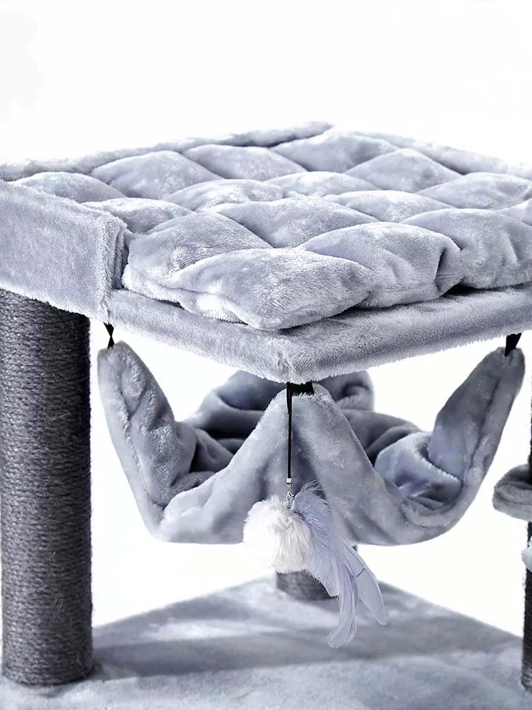 See on see, mida iga kass soovib – kraapimisposti või kraapimisplaati, mis on nende kõrgusele vastav. Ülemise korruse pehme plüüsiga platvormil saab kass kõigel silma peal hoida. Kuid see pole veel kõik. Sellel super luksuslikul kraapimispostil on ka peened kõrged puud, kuhu ronida, koos täiendava magamisplatvormiga ja kolm võrkkiike imeliselt kauni une jaoks!
