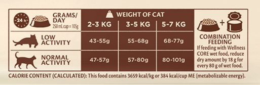 Kombineeritud toitmine: Wellness CORE märgtoiduga toitmisel kuivaine kogust 18 g võrra iga 80 g märgtoidu kohta.