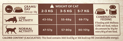 Kombineeritud toitmine: Wellness CORE märgtoiduga toitmisel kuivaine kogust 18 g võrra iga 80 g märgtoidu kohta.