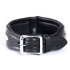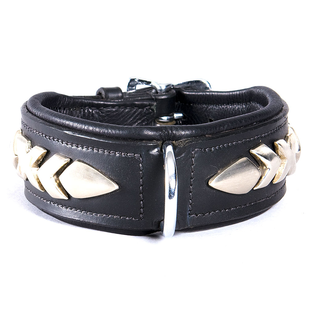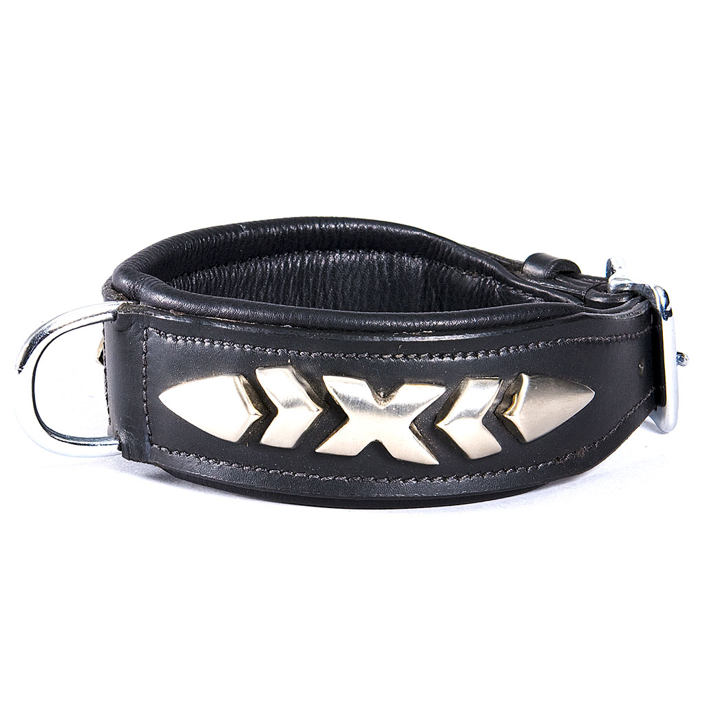 Kvaliteetsest nahast pehmendusega kaelarihm, mida kaunistavad roostevabast metallist dekoratsioonid.Â