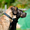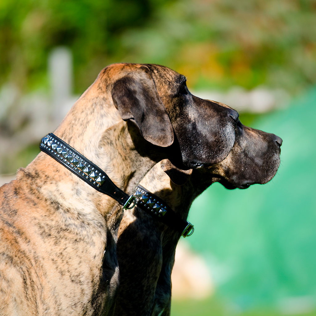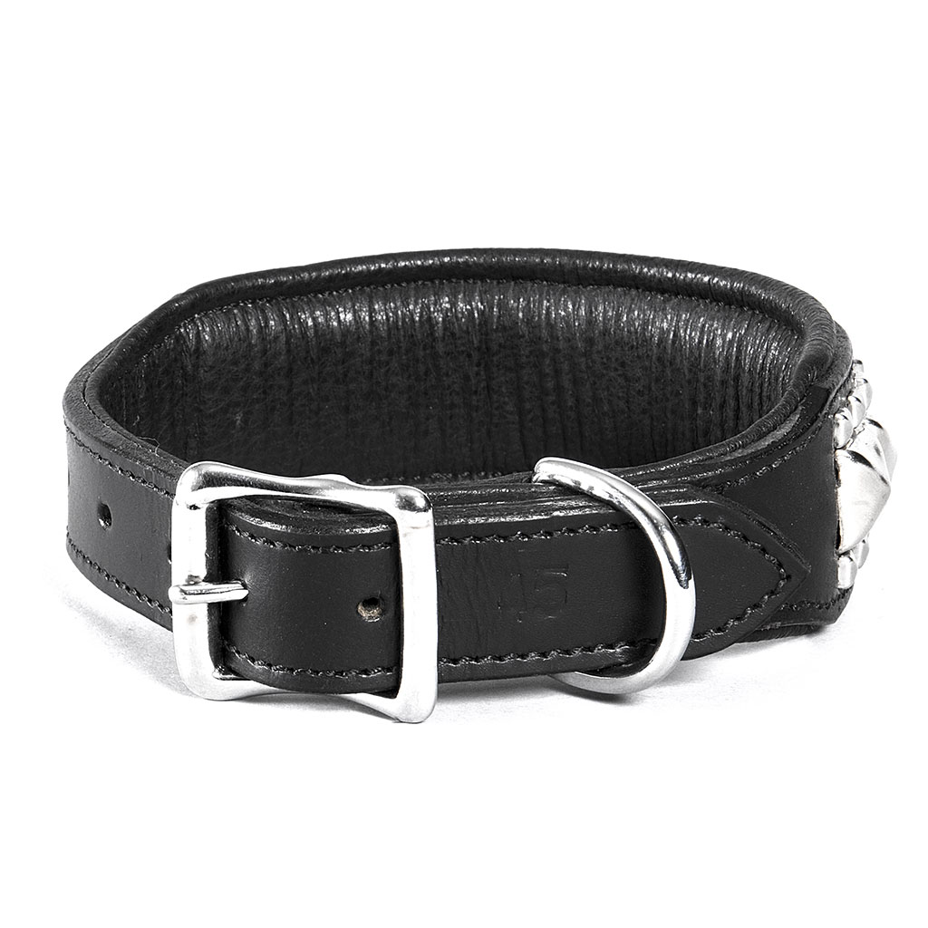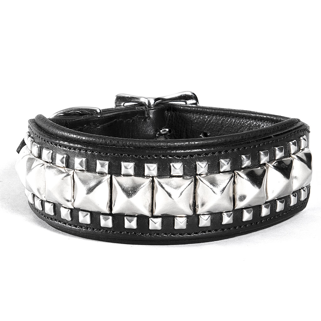 Kvaliteetsest nahast pehmendusega kaelarihm, mida kaunistavad roostevabast metallist püramiidid.