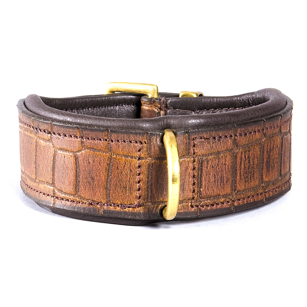 Kvaliteetsest nahast pehmendusega kaelarihm, mida kaunistab krokodillinaha imitatsioon. Messingust detailid.