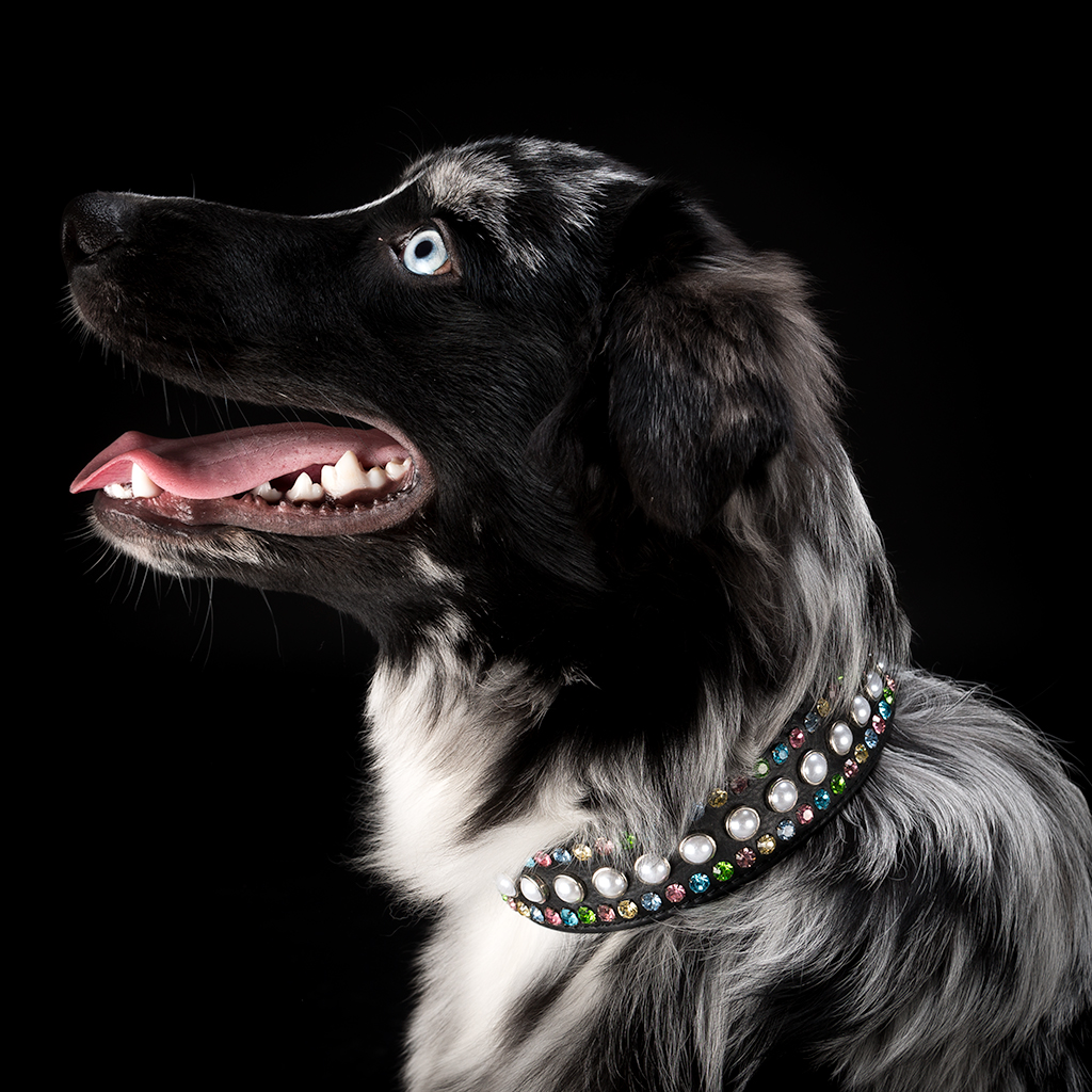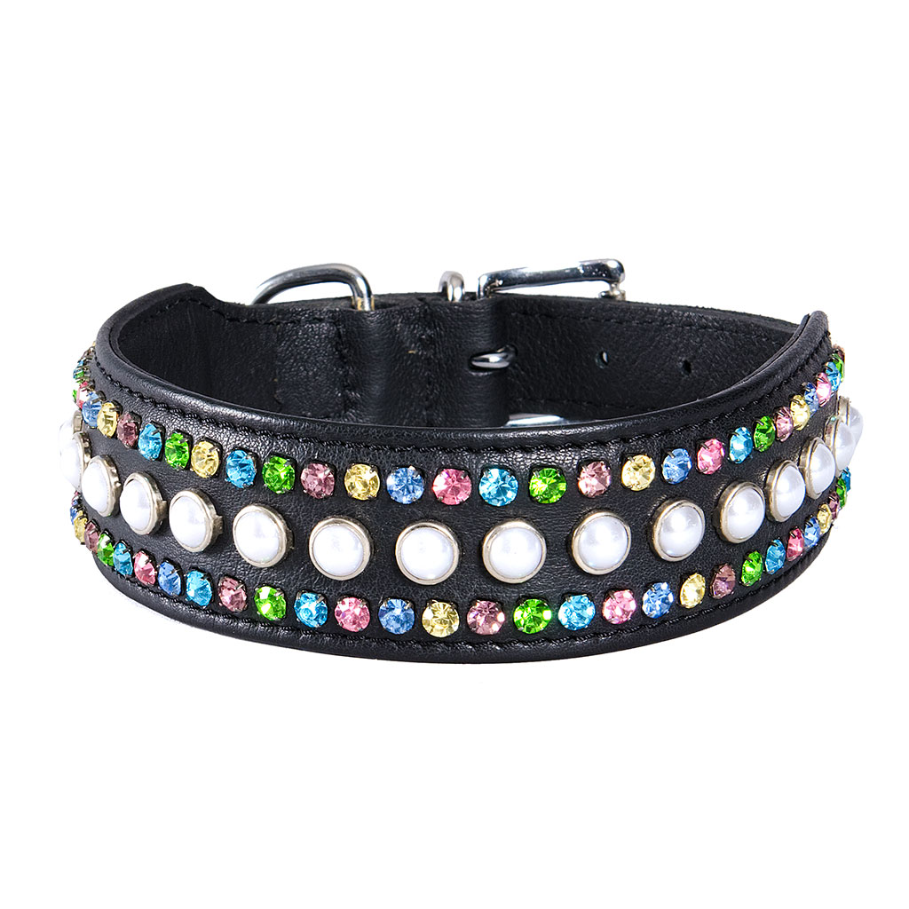 Kvaliteetsest nahast pehmendusega kaelarihm, mida kaunistavad värvilised kristallid ja valged pärlid.