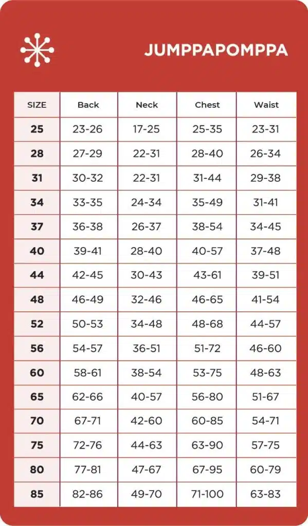 Kõik Pomppa suurused vastavad koera seljapikkusele. Seda mõõdetakse kaelarihmast kuni saba alguseni. Kõik mõõdud on sentimeetrites. Õige suuruse on kõige ligilähedasem mõõt.