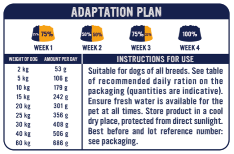 Adaptsiooniplaan: esimesel nädalal asenda Primal Spirit toiduga 25% oma koera tavapärasest söödast, teisel nädalal 50%, kolmandal 75% ning neljandal nädalal 100%.