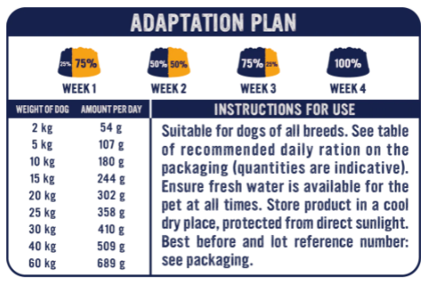 Adaptsiooniplaan: esimesel nädalal asenda Primal Spirit toiduga 25% oma koera tavapärasest söödast, teisel nädalal 50%, kolmandal 75% ning neljandal nädalal 100%.