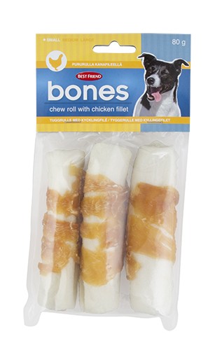 Veisenahast närimispulgad mille ümber on kuivatatud kanafilee. Pakis 3 tk, S/M suurus.