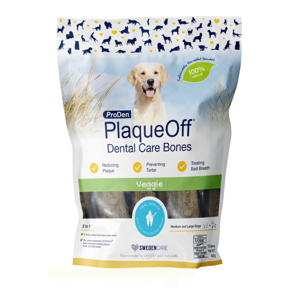 PlaqueOff ysstem Dental Care Bones Veggie on 100% looduslikud maitsvad kondikujulised närimismaiused koertele hambakivi ja hambakatu ennetamiseks ja eemaldamiseks ning hingeõhu värskendamiseks.
